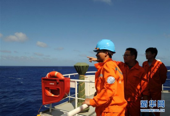 “彩虹鱼”科考团队队员搜寻浮出海面的着陆器(12月15日摄)。 世界最深的海沟——马里亚纳海沟近日迎来中国“彩虹鱼”科考团队。他们乘坐“沈括”号一路远航来到这里,探索海洋最深处的科学奥秘。 新华社记者 张建松 摄